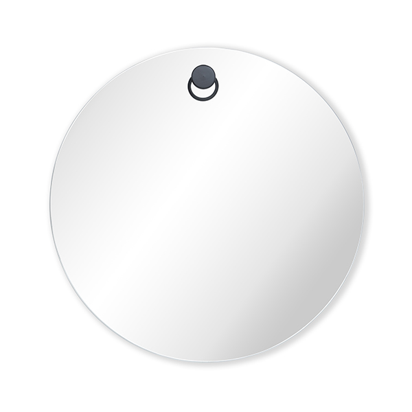 Espejo redondo con borde pulido, ojal de perforación con PVC negro y colgante en madera negra